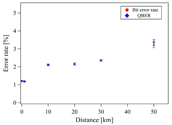 We next experimentally investigated the proposed DSQC protocol for various quantum channel lengths. In this experiment, Alice sent a 655,360-qubit train to Bob, and then Alice randomly selected message modes with 50% probability. In the message mode, Alice encoded pre-processed data bits into polarization qubits after their conversion from message bits, considering the subsequent error correction. The remaining 50% probability was in the control mode and confirmed the security of the DSQC system via the BB84 protocol. The control mode used the same procedures as the BB84 quantum key distribution protocol. Its sifted key rate was 15 kbps with a 10 km single-mode fiber link, and the QBER was about 2% (Figure 4 and Figure 5). The QBER is related to a variety of factors, including detector noise, optical misalignments, polarization mode dispersion, Raman scattering, and so on. In this experiment, the QBER was affected by the optical axis mismatch between several wave plates (not shown in Figure 3) used for high-speed polarization encoding/decoding with Pockels cells (PC1, PC2, and PC3) in free space. In the message mode, the data rate was 15 kbps with the 10 km fiber. This is the same rate as the sifted key rate in the control mode and is reasonable because Alice and Bob have a 50% probability of sharing the basis, as Alice randomly selected - or - bases and Bob measured - or - bases.