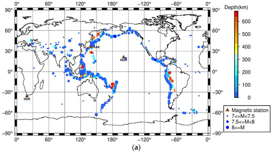 - Rabeh, T.; Miranda, M.; Hvozdara, M. Strong earthquakes associated with high amplitude daily geomagnetic variations. Nat. Hazards 2010, 53, 561–574. [Google Scholar] [CrossRef]
