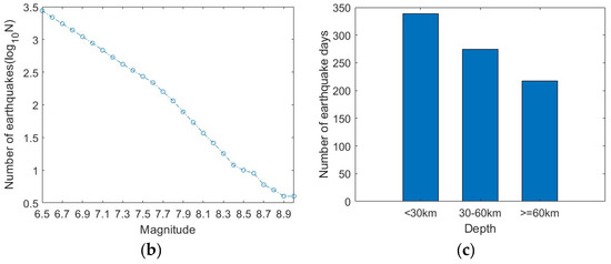 The earthquake data in this study include global M ≥ 7.0 earthquakes according to the United States Geological Survey (USGS) catalogue (https://earthquake.usgs.gov/earthquakes/search/). Figure 1 shows the locations of the earthquakes and the numbers of earthquakes for different magnitudes and depths. As seen in Figure 1b, earthquakes with M ≥ 7.0 are complete.