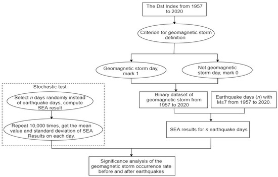 SEA is a method to analyze the typical characteristics, periodicities, and consequences of a special event, which can be used to extract information from the time series of the finite scale containing the noise [34,35], and has been introduced in the studies of earthquakes [14,15,36]. In this paper, we apply the SEA method to test the geomagnetic storms before and after the earthquake days. First, we check the Dst index from 1957 to 2020 and define a storm day if the minimum value of the Dst indices on that day is less than a given criterion. If it is a storm day, we set the day as 1, otherwise as 0. According to this mean, we obtain a new binary dataset in terms of geomagnetic storm activities. Second, we take a sub-dataset from the binary data for each earthquake 30 days before and after its occurrence day. The timespan of each sub-dataset is 61 days and centered at the earthquake day. Third, we repeat the procedure for all the selected earthquake days and add up the counts for all data sets, then obtain the SEA result in terms of the geomagnetic storms. To evaluate the statistical significance, we use the Monte Carlo method to select random days whose number is the same as the number of earthquake days and then perform the same procedure described above to get the random SEA for geomagnetic storms. We repeat such random SEA tests 10,000 times to compute the mean, and the corresponding standard deviation of each day in 61 days’ time window. Figure 2 shows the detail flow chart of the SEA method. It should be noted that we only count one earthquake day if there are several earthquakes occurring on the same day. In such a case, the depth of the first earthquake is taken as the depth of the earthquake day.