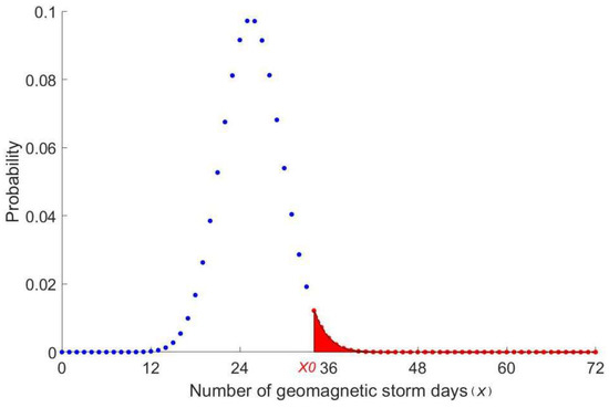 where the parameter x is the number of geomagnetic storms on the given day, n is the total number of earthquake days, and the p is the proportion of the total geomagnetic storm days to the total days from January 1957 to June 2020. As an example, Figure 3 shows the probability for obtaining a different number (x) of weak storms and above in the random case, where p = 35.6% and n = 72. The significance level of X0, i.e., the probability of obtaining X0 storms or more, is given by,