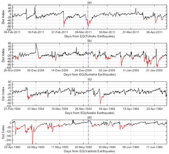 The Dst index variations in the time span of ± 30 days for four earthquakes: (a) Tohoku, Japan 11 March 2011 M = 9.1; (b) Sumatra, Indonesia 26 December 2004 M = 9.1; (c) Alaska, America 28 March 1964 M = 9.2; (d) Valdivia, Chile 22 May 1960 M = 9.5.