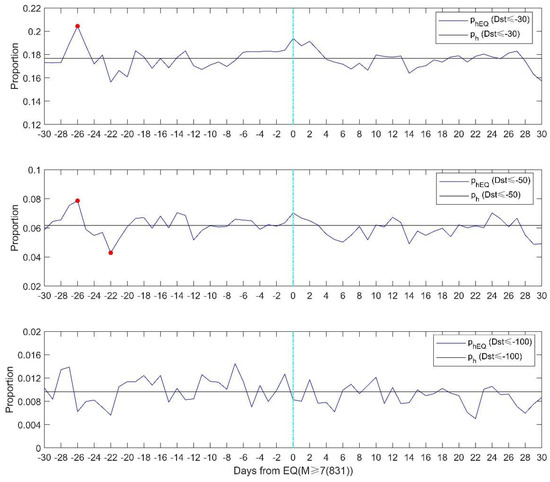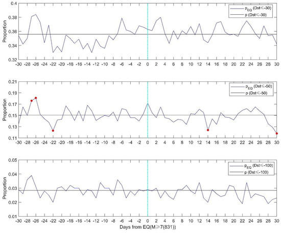 The proportion of the number of geomagnetic storm days to the total number of days (black lines) and the proportion of storm days to total earthquake days for the 831 M ≥ 7.0 earthquake days (blue lines). From top to bottom, the thresholds for storm definition are Dst ≤ −30 nT, Dst ≤ −50 nT, and Dst ≤ −100 nT, respectively. The red dot denotes 0.05 significance level of the Z test.