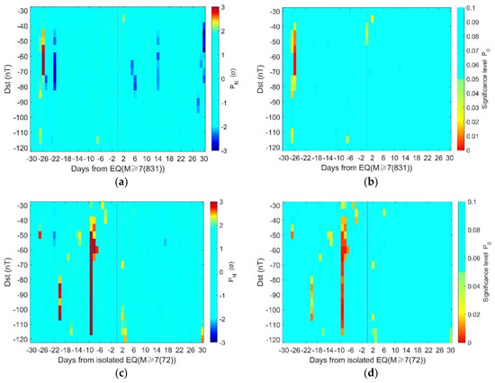 (a) Normalized probabilistic intensity () for the 831 M ≥ 7.0 earthquake days; (b) the significance level of geomagnetic storms in relation to the 831 M ≥ 7.0 earthquake days; (c) the normalized probabilistic intensity () for the 72 M ≥ 7.0 ‘isolated’ earthquake days; (d) the significance level of geomagnetic storms in relation to the 72 M ≥ 7.0 ‘isolated’ earthquake days. Note that in panels (a,c), PN within ± 2σ is presented in the same color. In panels (b,d), the color bar only extends to 0.1, and those above 0.1 are presented in the same color.