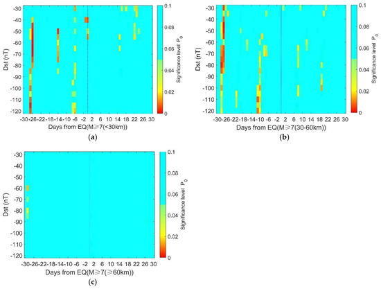 The significance level of geomagnetic storms in relation to earthquakes with different depths. (a) Depth <30 km, 339 earthquake days; (b) depth 30–60 km, 275 earthquake days; (c) depth ≥ 60 km, 217 earthquake days. Note that the color bar only extends to 0.1 and those above 0.1 are presented in the same color.