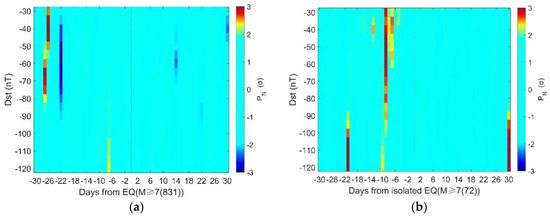 The SEA result using geomagnetic storm cumulative hours: (a) The result from a Superposed Epoch Analysis (SEA) showing the Dst-Time spectrogram for 30 days before and after the occurrence day of 831 M ≥ 7.0 earthquake days of normalized probabilistic intensity constructed from random days. (b) The result from a Superposed Epoch Analysis (SEA) showing the Dst-Time spectrogram for 30 days before and after the occurrence day of 72 ‘isolated’ M ≥ 7.0 earthquake days of normalized probabilistic intensity constructed from random days. Note that PN within ± 2σ is presented in the same color.
