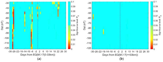 The significance level of geomagnetic storms in relation to earthquakes with different depths. (a) The result of 30 days before and after the occurrence day for 378 M ≥ 7.0 earthquake days and depth at < 33 km. (b) The result of 30 days before and after occurrence day for 453 M ≥ 7.0 earthquake days and depth at ≥ 33 km. Note that the color bar only extends to 0.1 and those above 0.1 are presented in the same color.