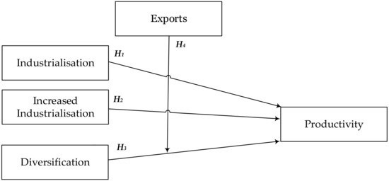 More recently, Zhao and Tang [72] examined the sources of economic growth in China compared to Russia in the period between 1995 and 2008, finding that increased economic growth in Russia was stimulated largely by the service sector, which was followed by the primary sector. On the contrary, in China, increased economic growth was largely achieved through the contribution of the industrial sector and to a lesser extent by the service sector. In addition, the hypothesis of a non-linear relation between industrialization and economic growth is not rejected, according to the evidence found in the study by Ortiz et al. [73], who argue that every society should strive to achieve a minimum level of industrial technological integration before being able to reap the benefits of industrialization in the form of economic growth. If the hypothesis was rejected, it would imply that countries enjoy the benefits of industrialization in economic growth once they go beyond a certain threshold of technological integration in the industrial sector. Although the empirical evidence reflects the impact of industrialization on economic growth and not directly on productivity, with the proviso that productivity can be an indicator revealing various economic indicators, in that it provides a measure of economic growth, the above results in the following research hypotheses: