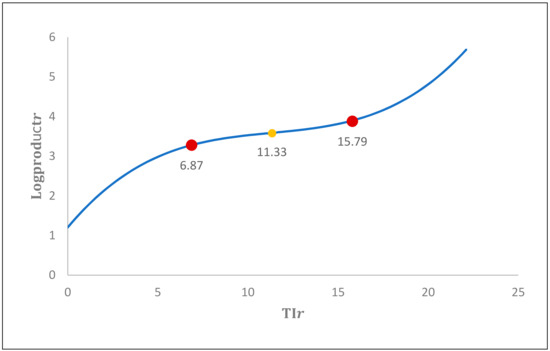 The result obtained implies that for a given rate of industrialization up to 6.874, industrialization is a determinant factor restricting productivity, while above this figure, increased industrialization is found to be a determinant factor with a positive effect on productivity. Consequently, the empirical results obtained now indicate the existence of a non-linear relation between the rate of industrialization and productivity. In turn, calculation of the second-order partial derivative given by identifies 11.333 as the point of inflection from which industrialization stimulates productivity. In more detail, x = , which corresponds to the yellow point in Figure 2.