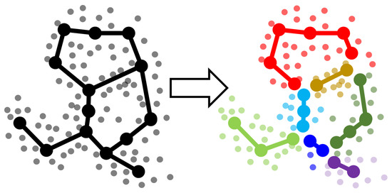 Decomposing a graph into non-branching segments and partitioning the data accordingly to the graph segments. Segments are defined as paths with ends at branching or leaf nodes. Branching nodes belong to several segments—so for better illustration here it is emphasized by multiplexing branching nodes and slightly diverging these copies from their origin (it is for illustration only). Toy example of a graph approximating a cloud of data points (shown in grey), and using its decomposition into non-branching segments for partitioning the data which defines clustering of the data cloud.