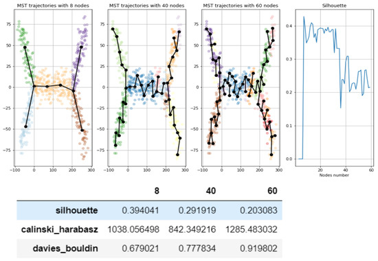 Example of estimating trajectories with the help of unsupervised clustering scores—better trajectories—get higher scores. Consider three graphs approximating the dataset of dumbell like shape with 2 branching points. We choose graphs such that the first graph fits nicely the structure of the dataset, while graph with 40 nodes fits dataset in worse way (it has several branching nodes which does not correspond to underlying dataset) and the last graph is even worse (i.e., has even more branching nodes). Thus the good score should assign best score to the first, second to the second, etc. Silhouette and Davies-Bouldin scores fit that expectation: the first graph (8 nodes) has the best scores, the second (40 nodes) the second best and the third (60 nodes) is the worst. While Calinski–Harabasz index assigns the best score to the third graph, which is counter-intuitive, nevertheless it correctly orders the first and the second graphs. (The choice of concrete graphs (and nodes numbers 8,40,60) is somewhat arbitrary the only purpose is to illustrate that scores fit the intuition—good score—corresponds to good approximating graph). Thus the figure indicates that unsupervised scores can be used to select the best graph; however, that should be done with certain care. The rightest plot confirms the same conclusion in the other way. We plot silhouette scores values for all values of nodes between 6 and 60 is given (graphs are constructed by Minimal Spanning Tree (MST) technique). It is clear that large node number correspond to lower scores on that plot, and that fits the expectations; graphs with large number of nodes constructed by MST will create many branch points which does not fit the given dataset, which has only 2 branching points. Thus it again confirms the principle—bad scores—bad approximating property.