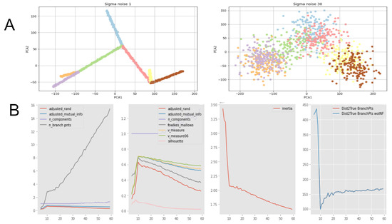 (A) Examples of datasets with known underlying graph structure, a symmetric binary tree with 7 edges. Datasets are 20-dimensional, visualized with PCA. The first one is with low level of noise and the second one with high level of noise. Note that despite that the noisy dataset may visually seem quite difficult for the correct graph approximation, it is distortion of 2-dimensional visualization; in original 20-dimensional space correct graph approximation is not that unlikely as one can see here. (B) Demonstration of agreement of our scores and naive scores like number and mutual distance to branching points, etc. On these plots X axis is number of nodes for approximate graph construction. The main observation is that ten nodes is the best value from all points of view: from our scores (the second subplot-adjusted Rand index, adjusted mutual information, Fowlkes–Mallows, etc.) as well as from the comparing distances between ground truth branching points and approximate branching points (the forth subplot), as well as elbow rule for inertia (the third subplot), as well as number from looking on number of branching points (the first subplot); ground truth has three branching points; approximate construction has three branching points for when number of nodes equal to 10 (first subplot gray line). All plots are average values over 100 randomly generated datasets having the underlying graph ground truth structure of the same shape, symmetric binary trees with 7 edges (3 branch points). See provided notebooks for details.
