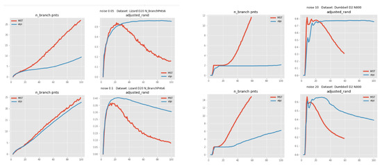 Figure 6 demonstrates the results of the simulations. One can see that blue plots (ElPiGraph) are much flatter than red ones (MST) which shows higher stability of ElPiGraph. We do not show all types of the datasets and all scores, in order not to overload the figures. Only plots for four types of datasets, for adjusted Rand score and for number of branching points are presented. The results for other dataset types and other scores are quite similar and does not change the conclusions.