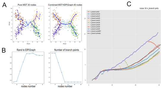 Figure 7A,B give one example of such behavior, ElPiGraph initialized by 30 node MST graph in 5 steps produces a graph similar to the case when ElPiGraph was applied without initialization by MST, despite that initialization was drastically different: it had a large number of branching points and was quite non-smooth. Figure 7C confirms similar phenomena in statistical manner: each point of each plot is result of averaging over hundred of simulated tree-like datasets. Result for other dataset types and other scores are similar. Combination of MST and ElPiGraph can be useful in some cases, for example for large number of nodes current implementation of MST works faster, so one can first create a “draft” graph by MST and then “polish” it by ElPiGraph, thus gaining faster implementation.