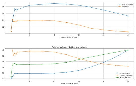 The MST-based GBDA algorithm is applied, and the constructed tree is compared with ground truth graph using the adjusted Rand index-based score and also scored by unsupervised score (not requiring the ground truth). MST construction depends on the node number parameter. One can see (Figure 8) that for all unsupervised scores the range 20-40 of the parameter gives almost highest scores, thus that range is quite a good choice of the parameter. It is quite in agreement with supervised score based on adjusted Rand index - which achieves it maximum for 40 nodes. And also we can check that number of branching points is 3 at this range as for the ground truth. Thus we see unsupervised scores provide reasonable suggestion for the choice of the parameter. The only thing we should mention is that we see some incorrect maximum for the unsupervised scores for very small value of parameter, e.g., 6 for silhouette, however that maximum is not stable. So to conclude one should use unsupervised scores with certain care, not just taking the maximum value, but checking its stability and if possible some subject area (e.g., biological) meaning.