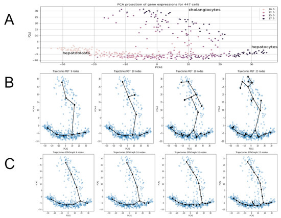 Cellular trajectory inference for single cell RNA sequencing data is important research direction in modern bioinformatics [15,16]. Since it can provide biological insights into important processes: cell differentiation, cell cycle and development of pathology like cancer. In the present section we demonstrate our approach on a single cell transcriptomic dataset from [31]. The data describes 24,748 gene expressions for 447 cells from liver of mouse embryos. The process under consideration is differentiation of bi-potential hepatoblasts into hepatocytes and cholangiocytes (two main different cell types in the liver). Figure 9A shows PCA projection and indicates regions for these three cell types.