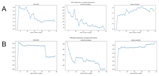 In order to make these conclusions we constructed approximating graphs using MST and ElPiGraph approaches for different node numbers and calculated the unsupervised metrics proposed above. Both methods were applied after PCA-based linear dimensionality reduction to 50 dimensions since such use of PCA is standard preprocessing for single cell datasets. Biological background suggests that the correct trajectory should have exactly one branching point, since the process is differentiation of bi-potential hepatoblasts into two cell types (hepatocytes and cholangiocytes). Thus trajectories with large number of branching points are biologically incorrect. Figure 9B,C show that ElPiGraph method produces reasonable trajectories for 5–22 nodes, while MST only for 5–9 nodes, so ElPiGraph is much more stable. Using two unsupervised metrics (silhouette and Davies-Bouldin) we can very clearly distinguish the threshold node number 23, where the overbranching for ElPiGraph first appears (Figure 9B). Indeed these metrics abruply jumps at this point—see Figure 10B. Thus confirming our approach to use unsupervised metrics to tune parameters. (From Calinski–Harabas score it is less evident in that example). Using unsupervised scores for MST trajectories one can also get an indication for the correct values of the node number parameter, the threshold value is 10 nodes, where biologically incorrect branch first appears. While that indication is not fully perfect nevertheless one can see significant drop of scores beyond 9 nodes (Figure 10A). Moreover at 9 nodes there is local extremum for all scores, which is standard indication for parameters choice.