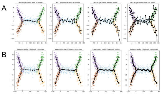 It is not surprising since its trajectories are defined by minimizing the functional containing the penalty for non-smoothness. This feature is related to stability of ElPiGraph with respect to parameters, especially compared to MST. Figure 5 shows examples of MST and ElPiGraph trajectories for the same node numbers. One can evidently see ElPiGraph trajectories are much smoother, and able to reproduce correct branching structure for much wider range of node numbers. Smoothness and stability are quite related, since non-smoothness of MST trajectories leads to creation of small incorrect branches of the graph, which does not happen for ElPiGraph.