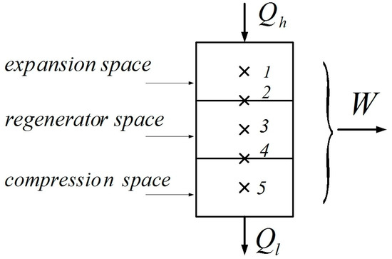 A classical way to model this engine with some realism is to use the Schmidt model. This analysis relies on the division of the engine into three spaces: expansion, compression, and regeneration spaces (Figure 3).