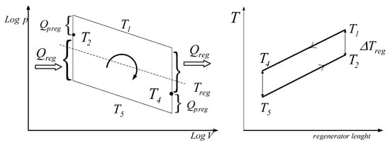 The internal irreversibility of this Stirling cycle is assumed to be due to the imperfect regeneration. The regenerator/displacer reciprocating movement forces the air of the cooling space towards the heating space and as well as away from it; it is also useful to store and release the heat exchanged with the regenerator material during this transfer (Figure 4). The working gas temperature at the exit of the regenerator towards the cold space is higher than , and the working gas temperature at the exit of the regenerator towards the hot space is lower than ; the difference is the temperature gap on the regenerator , which is assumed to be constant across the whole length of the regenerator. Thus, the regenerator efficiency is defined by the following: