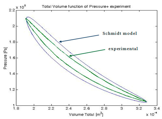 The cycle representation obtained with isothermal analysis (Schmidt model) and the experimental one in a p–V diagram.