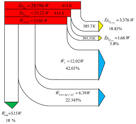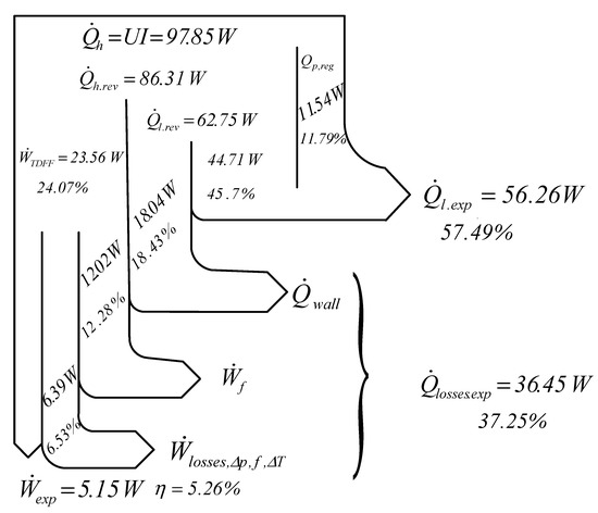 To complete the study, the exergetic analysis (Figure 7) allows for taking into account the temperature levels and estimating the different destroyed exergies due to internal and external irreversibility: imperfect heat regeneration and temperature difference between the sources and the working gas.