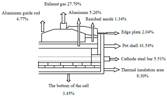 The reduction cell is the main equipment of aluminum smelting, and the typical prebaked aluminum reduction cell structure is shown in Figure 1. The basic process of aluminum smelting is as follows: Alumina melts in cryolite, under the action of current, CO2 and CO are produced on the anode carbon, and the molten aluminum is deposited at the bottom of the cathode carbon. In this process, some heat is used to heat the material in the cell to the electrolysis temperature and to complete the electrolysis reaction at this temperature, while the rest is lost to the surrounding environment in the form of heat. A typical 200 kA cell heat dissipation distribution is shown in Figure 2.