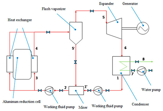 A WHPGS applied for the sidewall of aluminum reduction cells based on flash cycle with organic working fluids was proposed in this work. The schematic diagram is shown in Figure 3. The system consists of a group of heat transfer units installed at the sidewalls of aluminum reduction cells, a flash evaporator, a mixer, an expander with low boiling point fluid, a generator set, a condenser, and two working fluid pumps, etc. The digits in the figure represent the state codes of the import and export working fluid of each part.