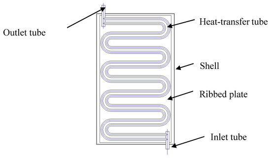 To obtain the waste heat from sidewalls of aluminum reduction cells, the heat exchanger was designed as shown in Figure 4, and main parameters are shown in Table 1. In the heat exchanger, heat-transfer tubes are made of copper with a serpentine arrangement. The aluminum reduction cell was charged. In order to ensure the safe operation of the system, we need something that has good thermal conductivity and poor electrically conductivity. The heat transfer efficient and electric resistance of alumina power is 10 W/mk and 10 MΩ/KV, respectively. The heat-transfer tubes are filled with working fluid, and alumina powders with good thermal conductivity and insulation performance are padded outside the tubes. The entire heat exchanger is installed in the ventilation space of aluminum reduction cells, in a good contact with the sidewalls of the aluminum reduction cell, and an insulation wool blanket is pasted to its outer surface.