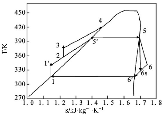Combining with the system schematic diagram (Figure 3), the T-S (Temperature entropy) diagram of the thermodynamic cycle is shown in Figure 6. Compared to the conventional ORC power generation system, there is an additional flasher to complete the process of depressing flash from saturated liquid to saturated steam and an additional mixer to complete the mixture of sub-cooled liquid and the liquid of cooler outlet in the proposed ORC.