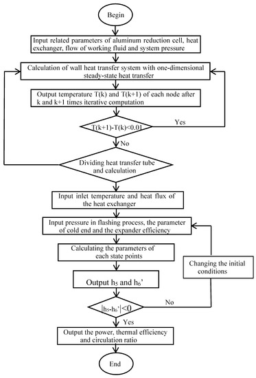 According to the above calculation models, a thermodynamic calculation algorithm was coded by using Matlab software (MathWorks.Inc Natick, MA, USA), and the properties of R123 were calculated by REFPROP 8.0 software. The program chart is shown in Figure 7.