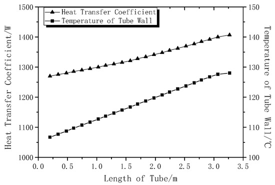 The changing relationship of the convective coefficient and the wall temperature along the length of the tube are shown in Figure 8. It can be observed from the figure that the convective coefficient and the temperature of the wall increase along the tube length, almost linearly. The temperature of the wall changes from 107 to 128 °C.