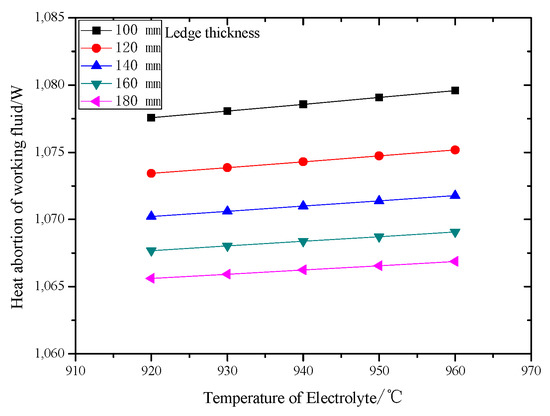 The relationship between heat-absorption of the working fluid for a set of heat exchangers’ (the total amount of heat exchangers are 36) changes and electrolyte temperature is shown in Figure 9. Results show that under the same thickness of freeze ledge, the heat-absorbing capacity increases with the increasing electrolyte temperature, but the change is small. The heat-absorbing capacity of working fluid decreases with increasing of the thickness of the freeze ledge, when the electrolyte temperature is fixed, and this infers that heat transfer rate is mainly determined by the thermal resistance of cell wall layers, and it cannot be effectively increased by raising the cooling intensity of the heat exchanger.