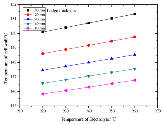 Temperature of cell wall at different electrolyte temperatures with various ledge thicknesses.