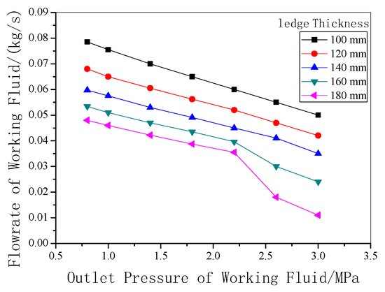 The relationship between the mass flow rate and system outlet pressure is discussed in Figure 11. It can be observed that the flow rate of working fluid decreases with increasing system pressure. Also, the flow rate is decreased with thicker freeze ledge under the same outlet pressure. The main reason is that the system pressure determines the temperature of working fluid, and the temperature of working fluid is directly related to the heat transfer rate.