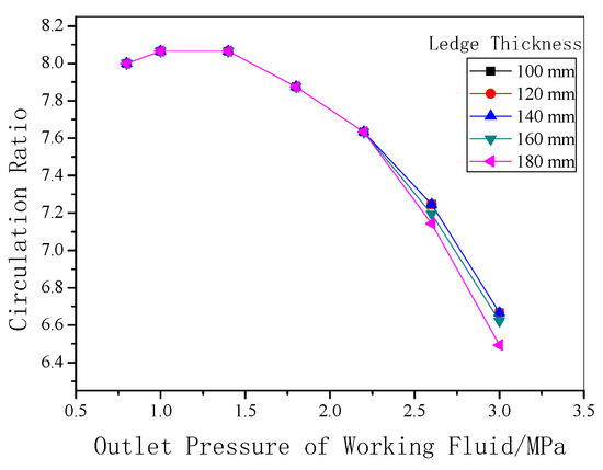 As shown in Figure 12, the circulation ratio of working fluid in the flash evaporator is closely related to the system pressure. When the system pressure is above 1.5 MPa, with increasing system pressure, the circulation ratio slightly decreases. However, there is no evident influence from the thickness of freeze ledge on the circulation ratio.