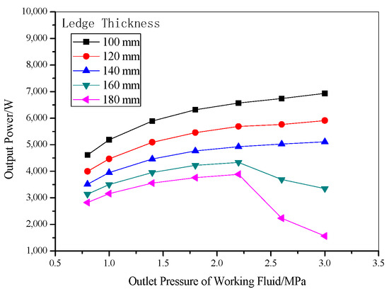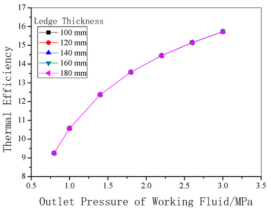 Thermal efficiency under different outlet pressures with various ledge thicknesses.
