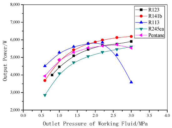 As observed in Figure 15, when different working fluid is used, there is a different relationship between the system output power and system pressure for an aluminum reduction cell of 200 kA series. For R123, R141b, R245ca, or pentane, with the increasing of system pressure, the output power of the system increases. When the system pressure is above 2.0 MPa, the system with R141b can generate the highest output power. Otherwise, the system with R113 will generate the highest output power. It can be concluded that if the system pressure is designed below 2.0 MPa, R113 should be the preferred working fluid, and when the designed system pressure is higher than 2.0 MPa, R141b should be the preferred working fluid.