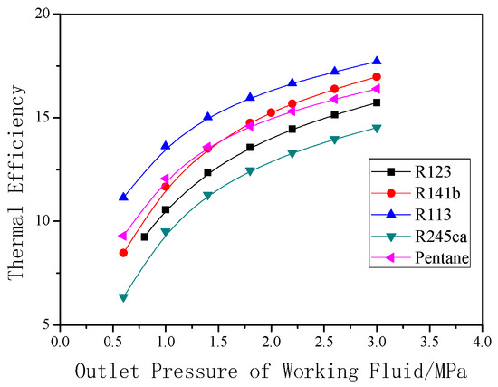 In terms of cycle efficiency, as observed in Figure 16, pentane demonstrates a greater advantage, followed by R141b, and the cycle efficiency of R113 is the lowest, which means it is two different things to pursue the biggest output power and the highest cycle efficiency in design of the system.