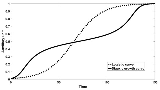 The comparison between the logistic curve and the curve with diauxic growth is presented in
