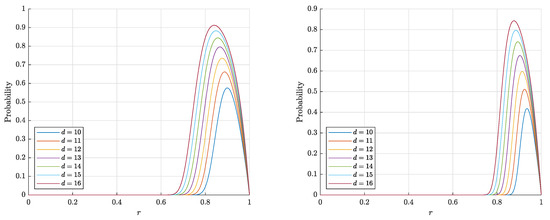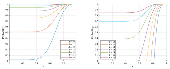 Figure 5. The graphs of the right-hand side of the estimate (3) for the probability P 1 F ( d , r , n ) that a random point is Fisher separable from a set of n = 1000 (left) and n = 10,000 (right) random points in the layer B d \ r B d .