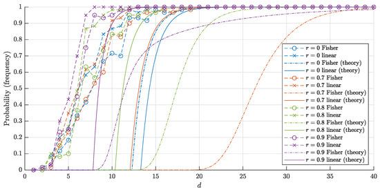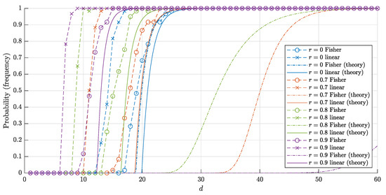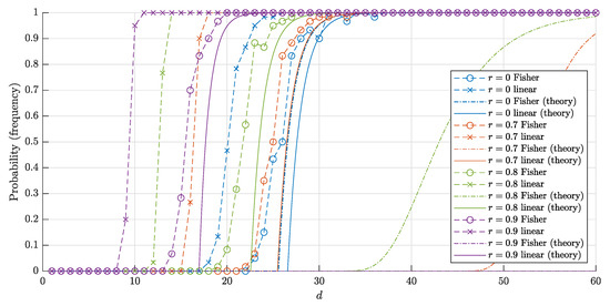 Figure 4. The graphs of the estimates for the probabilities P 1 ( d , r , n ) ( P 1 F ( d , r , n ) ) that a random point is linearly (and respectively, Fisher) separable from a set of n = 10,000 random points in the layer B d \ r B d . The solid lines correspond to the theoretical bounds (14) and (15) for the linear separability. The dash-dotted lines represent the theoretical bounds (2) and (6) for the Fisher separability. The crosses (circles) correspond to the empirical frequencies for linear (and respectively Fisher) separability obtained in 60 trials for each dimension d.