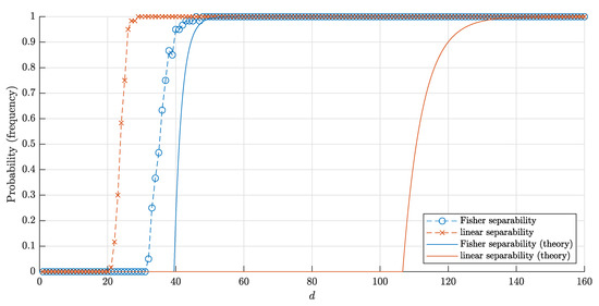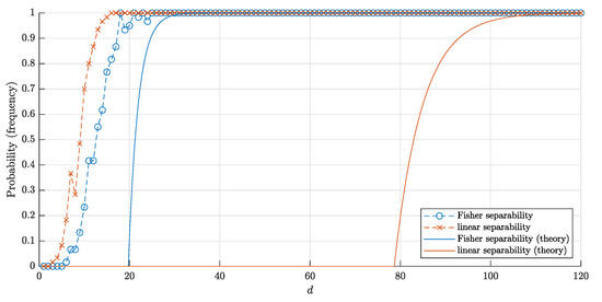 Now let M n = { X 1 , , X n } be the set of points chosen randomly, independently, according to the uniform distribution on the cube Q d . Let P ( d , n ) and P F ( d , n ) denote the probabilities that M n is linearly separable and Fisher separable, respectively. Let P 1 ( d , n ) and P 1 F ( d , n ) denote the probabilities that a random point chosen according to the uniform distribution on Q d is separable and Fisher separable from M n , respectively.