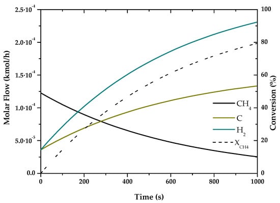 In Figure 2, Figure 3 and Figure 6, it can be seen that the molar flow profiles deviate considerably at a certain reaction time. This phenomenon is attributed to the fact that the steady state is reached more quickly in these processes. This suggests that the dimensions of the reactor or the reaction time used for the simulation in our software do not match those used in the literature, but these parameters do not affect the subsequent calculations. This profile could be smoothed out by studying a greater number of points in the reaction time in the range where the steady state is reached.