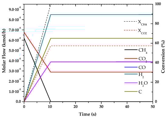 Evolution of molar flow profiles over time for Dry Reforming of Methane (T = 973 K; P = 1 bar).