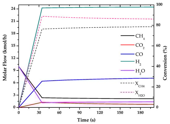 Evolution of molar flow profiles over time for Steam Reforming of Methane (T = 1000 K; P = 1 bar).