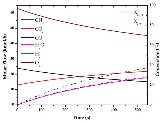 Evolution of molar flow profiles over time for Partial Oxidation of Methane (T = 1223 K; P = 1 bar).
