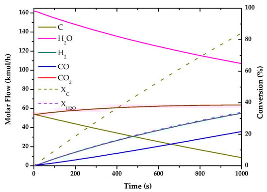 Evolution of molar flow profiles over time for Coal Gasification (T = 1123 K; P = 1 bar).