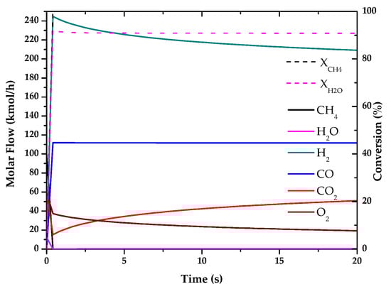 Evolution of molar flow profiles over time for Autothermal Reforming of Methane (T = 1510 K; P = 21 bar). The figures show the final molar flow results for each component involved in the reactions and fuel conversion, both as a function of the residence time to equilibrium, or to a fixed time known by the reference used for its simulation.