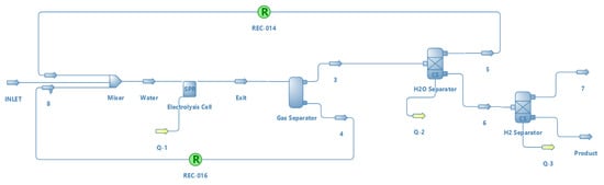For water electrolysis, only electricity is used as a source of energy, as water cannot be considered as such. Its simulation was different from the rest of the thermochemical methods. This simulation was carried out only by using the DWSIM software with an EXCEL sheet, where an electrical power consumption of 18 kW was prefixed.